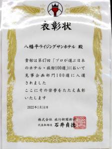 皆様にお知らせするのを忘れておりましたが、今年のお正月に旅行新聞新社さん主催のプロが選ぶ日本のホテル・旅館百選で企画部門で入賞させていただきました。